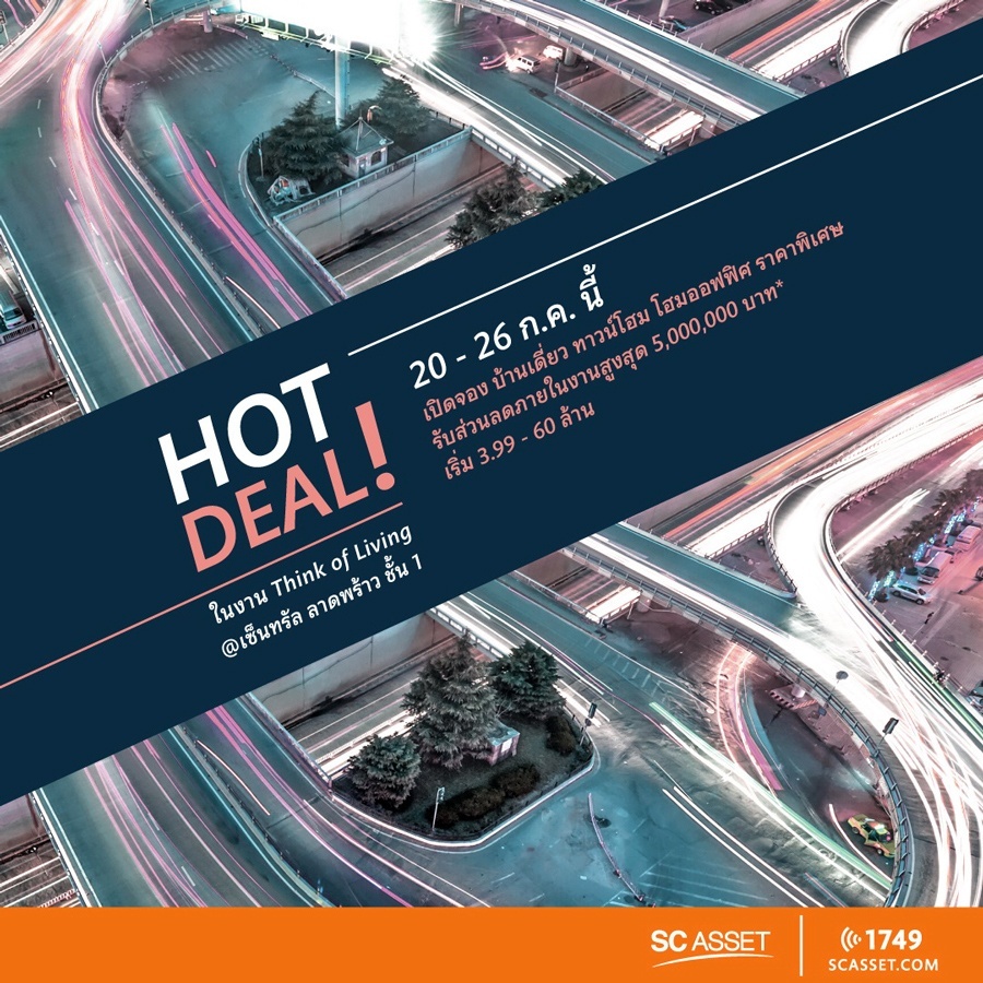 บริษัท เอสซี แอสเสท คอร์ปอเรชั่น จำกัด (มหาชน) หรือ SC จัดโปรสุดฮอตแห่งปี HOT DEAL! เปิดจองทั้งบ้านเดี่ยว ทาวน์โฮม โฮมออฟฟิศ และคอนโดมิเนียมพร้อมอยู่ ราคาพิเศษ พร้อมรับส่วนลดภายในงานสูงสุด 5,000,000 บาท* ราคาเริ่ม 2 - 60 ล้านบาท*