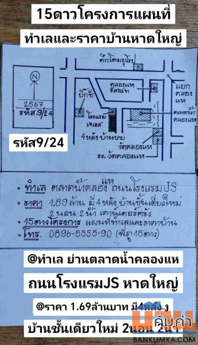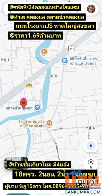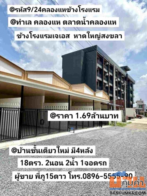 บ้านชั้นเดียวใหม่ มี4หลัง ตลาดน้ำคลองแห ถนนโรงแรมJS หาดใหญ่สงขลา