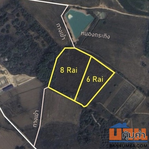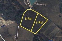 - ที่ดินแบ่งออกเป็น 2 แปลง ( 8 ไร่ และ 6 ไร่ )