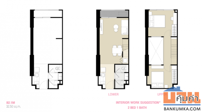 - 2 ห้องนอน ( ชั้นล่าง 32.5 ตร.ม. / ชั้นบน 24.5 ตร.ม. )