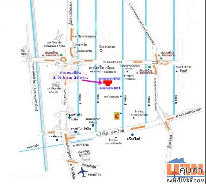 ที่ดินติดถนนซอยสาธารณะ 2 ด้าน คือซอยคลองสาม 5/11 (ซอยบุญธรรม) และซอยคลองสาม 5/13 (ซอยตาน้ำ) มีหน้ากว้างติดถนนซอย 5/11 ประมาณ 110 เมตร และหน้ากว้างติดถนนซอย 5/13 ประมาณ 53 เมตร