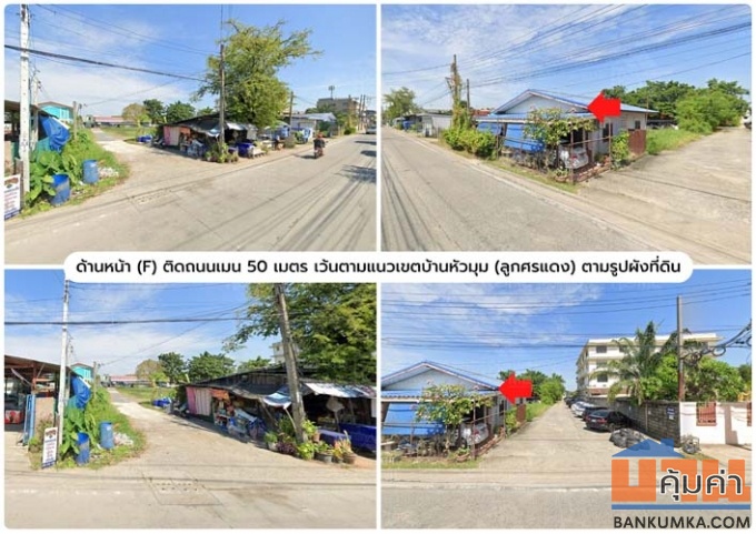 - ด้านหน้า (F) : ติดถนน 50 เมตร เว้นตามแนวเขตบ้านหลังมุม ตามรูปผังที่ดิน