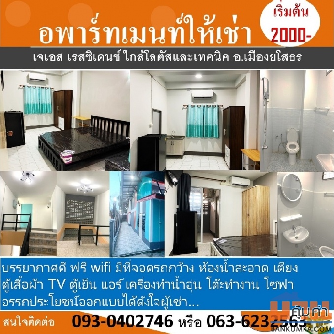 หัวข้อ อพาร์ทเมนท์ให้เช่า เจเอส เรสซิเดนซ์ ใกล้โลตัส วิทยาลัยเทคนิค ศูนย์ราชการจังหวัด อ.เมืองยโสธร เฟอร์นิเจอร์พร้อมเครื่องใช้ไฟฟ้า ราคาเริ่มต้นเพียง 2000 บาท