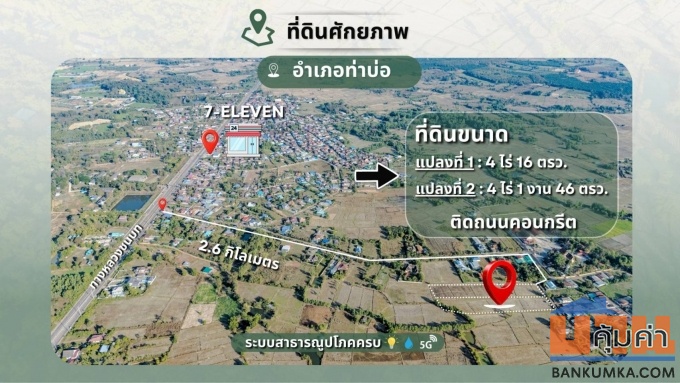 ขายที่ดินเปล่า 2 แปลงติดกัน 8ไร่ 1งาน 62 ตร.ว. ติดถนนคอนกรีต ทำเลทอง ท่าบ่อ หนองคาย