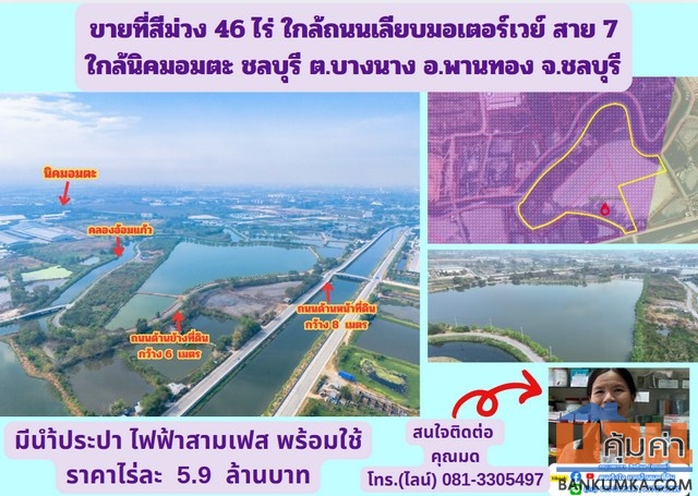 ขายที่สีม่วง 46 ไร่ ใกล้ถนนเลียบมอเตอร์เวย์ สาย 7 ใกล้นิคมอมตะ ชลบุรี ต.บางนาง อ.พานทอง จ.ชลบุรี