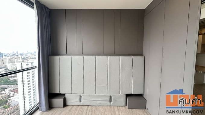 - ห้องนอนติดกระจกบานใหญ่ พื้นถึงฝ้า พร้อมชุดบิวท์อินหัวเตียง / ตู้เสื้อผ้า / ผ้าม่าน