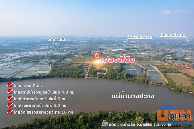ขายที่ดินติดแม่น้ำบางปะกง 59 ไร่ ตรงข้ามท่าเรือบ้านโพธิ์ ต.บ้านโพธิ์ อ.บ้านโพธิ์ จ.ฉะเชิงเทรา ขาย 2,800,000 บาท/ตร.วา