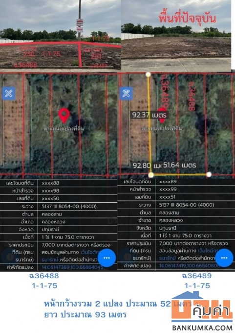 ขายที่ดินถมแล้ว 2 แปลงติดกัน พร้อมโฉนด คลอง 5 ธัญบุรี 2 งาน 80 ตรว. เข้าออกได้ 2 ทาง ใกล้มอเตอร์เวย์ ฟรีโอน ขาย 1,200,000 บาท