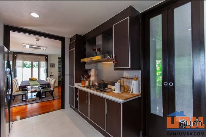 位于 Mooban Noblewana Watcharapol 内,这栋维护精美的两层住宅处于曼谷最令人向往的封闭式社区之一,完美融合了奢华、舒适与私密。定制设计的室内装潢以优雅的深色木质饰面为主,拥有4间宽敞的卧室、4间浴室、一间独立办公室以及一间宽敞的独立佣人房。