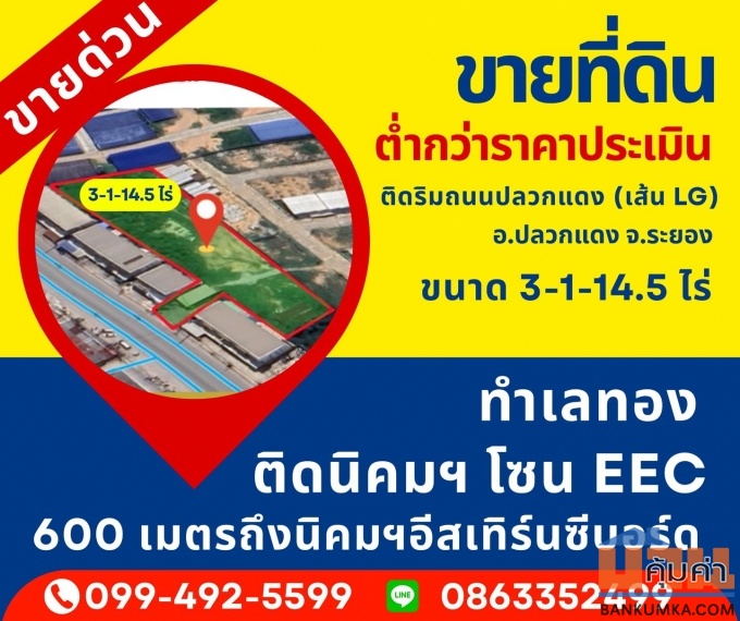 ขายด่วน ขายที่ดินต่ำกว่าราคาประเมิน ที่ดินติดริมถนนปลวกแดง เส้นLG