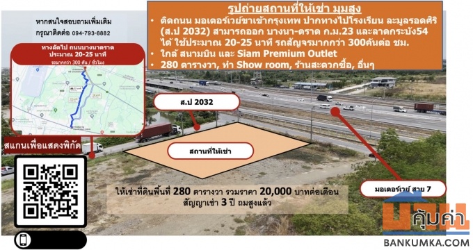 ให้เช่าที่ดินพื้นที่ 280 ตารางวา รวมราคา 20,000 บาทต่อเดือน สัญญาเช่า 3 ปี ถมสูงแล้ว