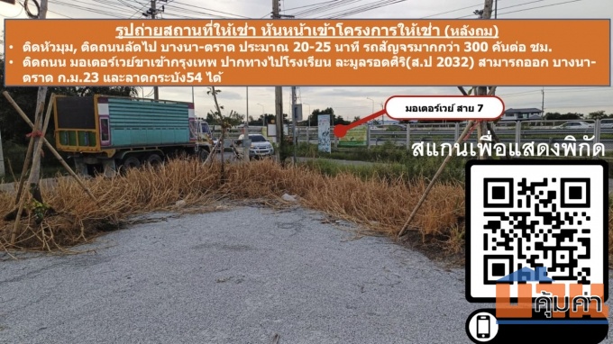 แปลงนี้ติดถนน มอเตอร์เวย์ขาเข้ากรุงเทพ ปากทางไปโรงเรียน ละมูลรอดศิริ(ส.ป 2032) สามารถออก บางนา-ตราด ก.ม.23 และลาดกระบัง 54 ได้