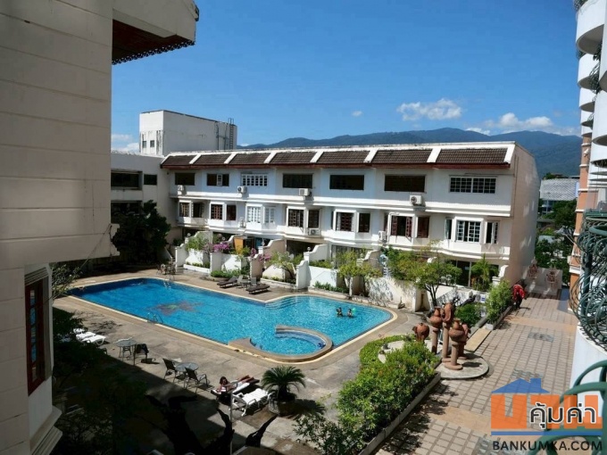 Corner unit with an open view overlooking the large swimming pool and Doi Suthep Mountain. The room receives natural light.