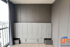 - ห้องนอนติดกระจกบานใหญ่ พื้นถึงฝ้า พร้อมชุดบิวท์อินหัวเตียง / ตู้เสื้อผ้า / ผ้าม่าน