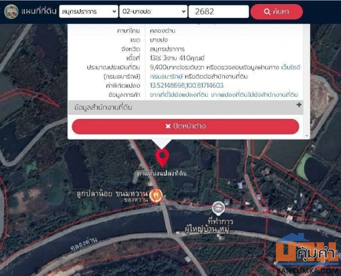 ขายเท่าราคาประเมินที่ดิน" บางเพรียง สมุทรปราการ แปลงมุม ติดถนน 2 ด้าน ที่ดิน 1-2-87 ไร่ ขาย 12,500 บาท/ตร.วา