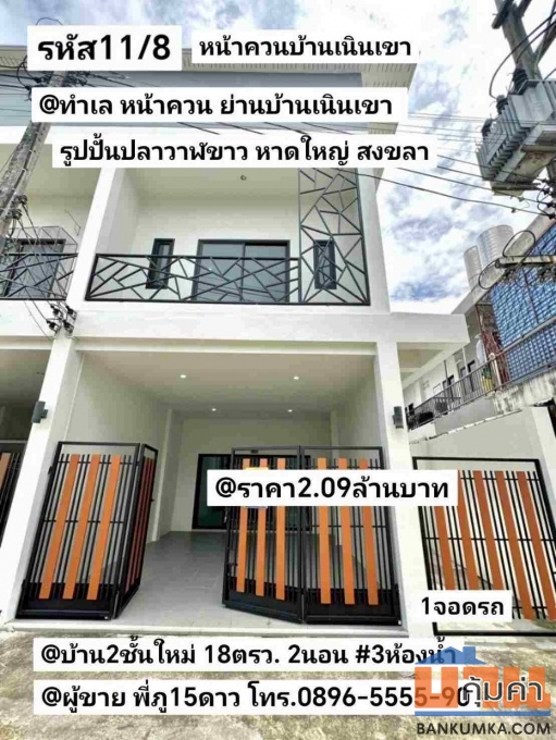 บ้าน2ชั้นใหม่ มี2หลัง หน้าควน ลานกีฬาบ้านเนินเขา ฝั่งรูปปั้นปลาวาฬขาว หาดใหญ่ สงขลา