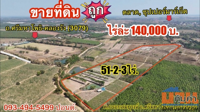 ที่ดินถูกปราจีนบุรี ใกล้เทศบาลกรอกสมบูรณ์ (หลังสนามไดร์ฟกอล์ฟ 304) |ไร่ล่ะ 140,000 บาท ( 51-2-3 ไร่.) ยกแปลง 7.2 ลบ. | ต.กรอกสมบูรณ์ อ.ศรีมหาโพธิ จ.ปราจีนบุรี